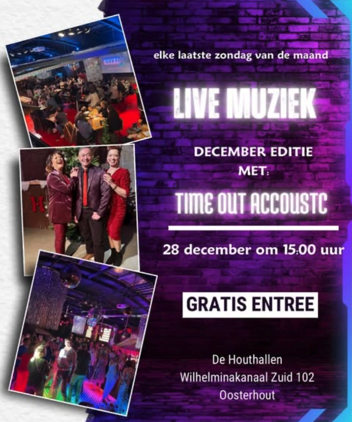 Ennn… de eerste editie wordt meteen een feestje! We trappen af met TIME OUT ACOUSTIC – een superenthousiaste, goede coverband die de mooiste kerstklassiekers, meezingers en fijne akoestische nummers speelt. De perfecte mix om je zondag én het jaar gezellig af te sluiten.
