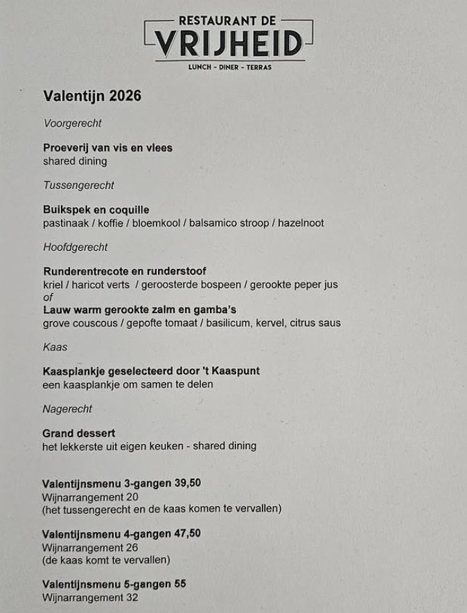 Zaterdag 14 februari is het weer Valentijn! Ook dit jaar hebben wij weer een speciaal Valentijnsmenu samengesteld waar jullie samen van kunnen genieten. Deze avond serveren wij uitsluitend ons Valentijnsmenu (3, 4 of 5 gangen).