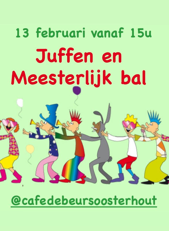 Juffen en Meesterlijk bal vrijdag, 13 februari 15:07 Café de Beurs Traditiegetrouw op vrijdagmiddag het “JUFFEN EN MEESTERLIJK BAL” Vanaf 15u zijn jullie weer welkom, DJ Peerke kijkt er al weer naar uit!! Lees verder Traditiegetrouw op vrijdagmiddag het “JUFFEN EN MEESTERLIJK BAL” Vanaf 15u zijn jullie weer welkom, DJ Peerke kijkt er al weer naar uit!! Klappeijstraat 4, 4901HE Oosterhout