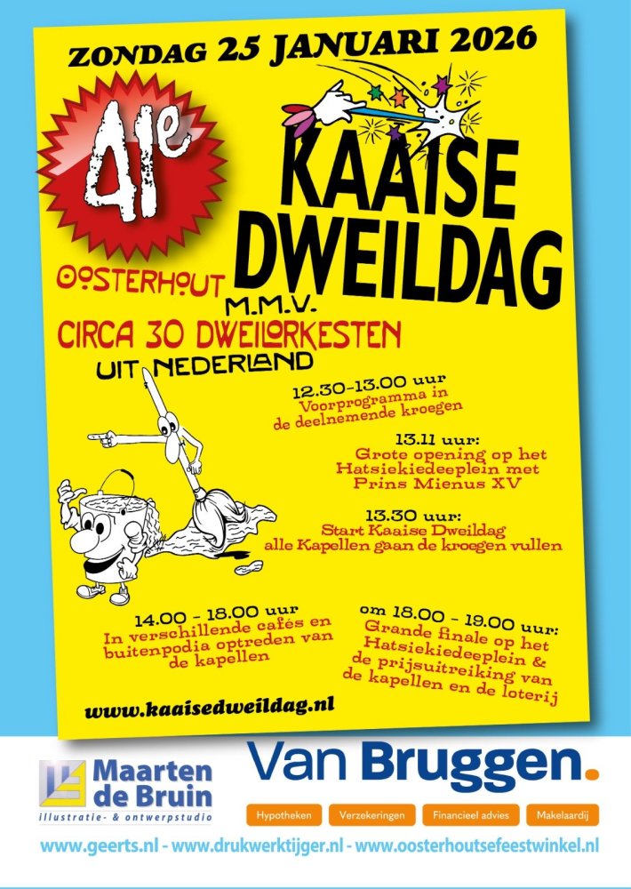 Op zondag 25 januari 2026 is het weer zover! Ter opwarming van Carnaval vieren we in het Brabantse Oosterhout (Kaaiendonk), op de zondag drie weken voor Carnaval, de jaarlijkse nationale Dweildag voor Carnavalsbands: de Kaaise Dweildag. Lees verder