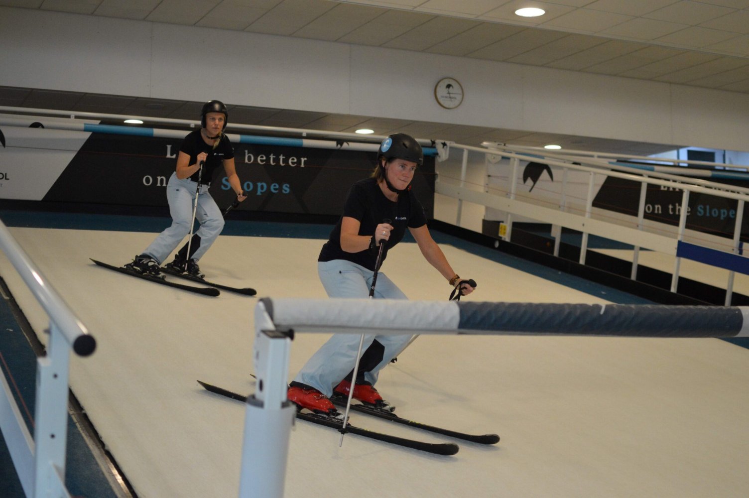 Bij Skischool Oosterhout starten beginnende wintersporters op een indoor rolbaan. In deze gecontroleerde en veilige omgeving leren zij stap voor stap de juiste houding, balans en beweging. Zonder afleidingen zoals wisselende sneeuwcondities of drukke pistes kan de focus volledig liggen op techniek.